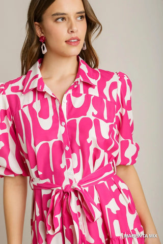 Make a statement in this striking magenta and white abstract print dress. The bold color-blocked design pairs perfectly with practical short sleeves and a crisp collared neckline for a polished look. A tie waist cinches your silhouette, creating flattering definition. Versatile enough for casual outings or dressed up for special occasions, this piece brings modern flair to any wardrobe.