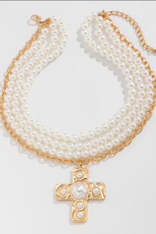 Elevate your ensemble with this sophisticated pearls and cross necklace, expertly designed to command attention. Featuring lustrous pearl strands paired with a striking oversized cross charm adorned with pearl beads, this piece seamlessly blends timeless elegance with contemporary style. The refined craftsmanship ensures this necklace becomes an essential statement accessory, transforming any outfit into a polished, fashion-forward look that reflects your discerning taste.